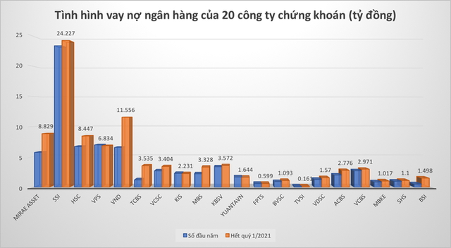 Xét về quy mô vay nợ ngân hàng, dẫn đầu đang là SSI với tổng dư nợ là 24.227 tỷ đồng; tiếp theo là VND với 11.556 tỷ đồng; Mirae Asset với dư nợ 8.829 tỷ đồng; HSC với dư nợ 8.447 tỷ đồng; VPS là 6.834 tỷ đồng…