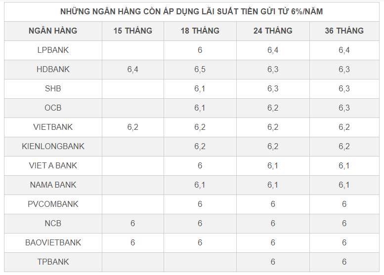 Theo thống kê, hiện chỉ còn 12 ngân hàng duy trì mức lãi suất huy động từ 6%/năm, gồm: LPBank, HDBank, SHB, OCB, VietBank, KienlongBank, VietA Bank, NamA Bank, PVCombank, NCB, BaoViet Bank và TPBank.