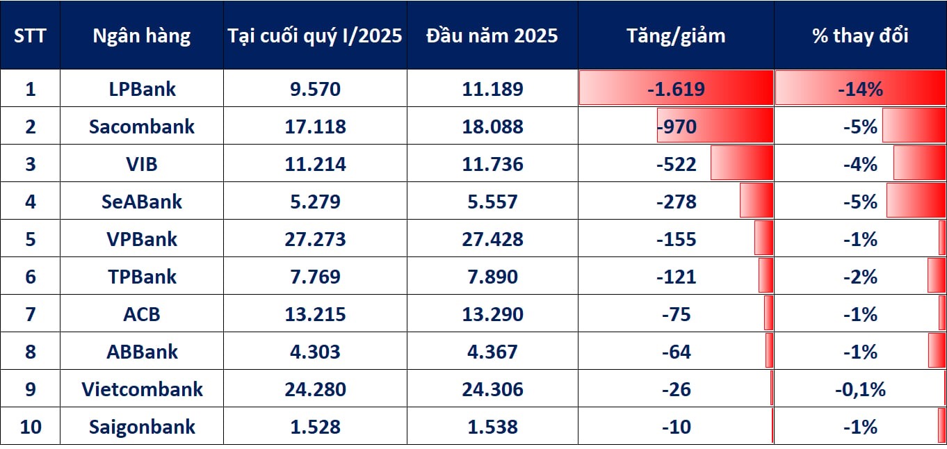 Trong đó, LPBank là ngân hàng ghi nhận mức cắt giảm nhân sự mạnh nhất trong quý, giảm tới 1.619 người, tương đương 14,5% xuống còn 9.570 nhân sự. Đây là mức giảm hiếm thấy trong thời gian ngắn chỉ trong ba tháng.