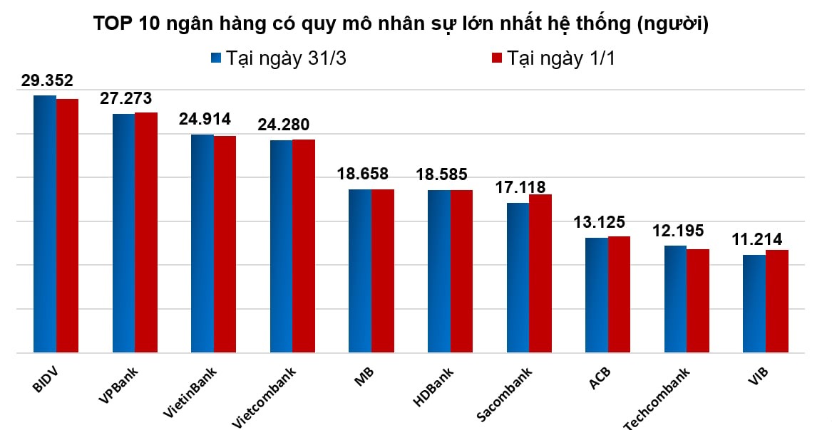 Trong bảng thống kê, một số ngân hàng chứng kiến sự sụt giảm về nhân sự nhiều (lớn hơn 100 nhân viên) trong ba tháng đầu năm như VIB giảm 522 người, SeABank giảm 278 người, VPBank giảm 155 người và TPBank giảm 121 nhân sự.