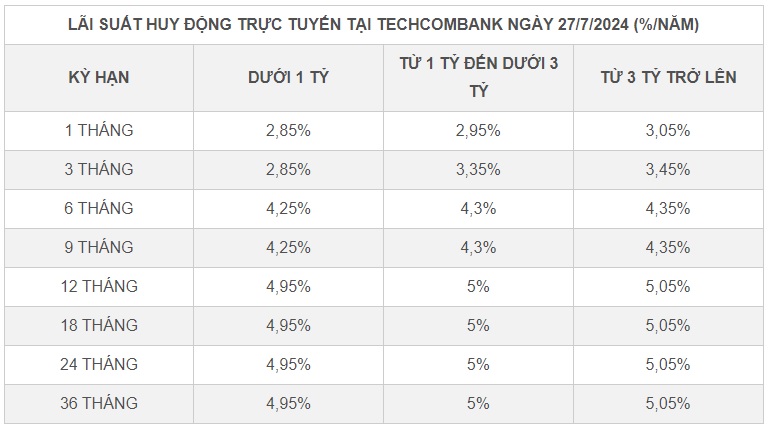 Techcombank quy định 3 mức lãi suất tiết kiệm, dưới 1 tỷ đồng, từ 1 tỷ đồng đến dưới 3 tỷ đồng và từ 3 tỷ đồng trở lên. Theo bảng lãi suất huy động trực tuyến với tài khoản tiết kiệm mở mới dưới 1 tỷ đồng, kỳ hạn 1-2 tháng là 2,85%/năm, 3-5 tháng 3,25%/năm, 6-11 tháng 4,25%/năm, 12-36 tháng 4,95%/năm.