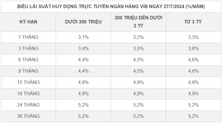 Đối với tiền gửi từ 15-36 tháng, VIB áp dụng chung một biểu lãi suất dành cho tất cả mức tiền gửi khác nhau. Như vậy, lãi suất huy động cao nhất tại nhà băng này vẫn là 5,2%/năm.
