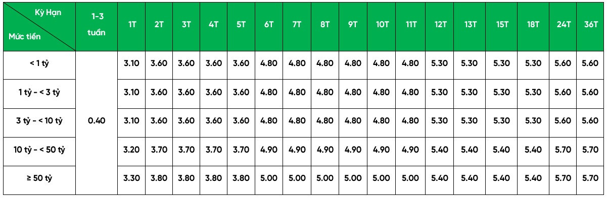 Lãi suất huy động các kỳ hạn từ 1-5 tháng được giữ nguyên cho tất cả mức tiền gửi. Sự phân hoá về lãi suất được thể hiện từ kỳ hạn 6 tháng trở lên với mức cao nhất dành cho tiền gửi từ 10 tỷ đồng trở lên.