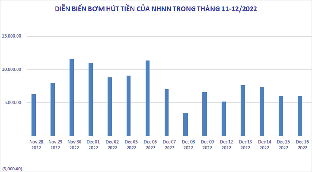 Trong ba tuần, kể từ 28/11-16/12, NHNN bơm ra thị trường qua kênh cầm cố giấy tờ có giá (OMO) tổng cộng gần 115.398 tỷ đồng, với hai loại hợp đồng kỳ hạn 14 ngày và 91 ngày, lãi suất tương ứng khoảng 6% và 6,5-7%.