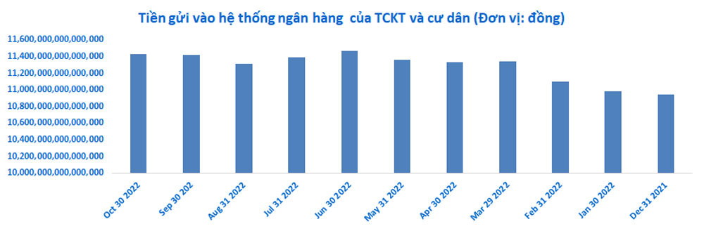 Theo thống kê của NHNN, tiền gửi vào hệ thống ngân hàng trong tháng 10/2022 tăng thêm 5.766 tỷ đồng so với tháng trước lên gần 11,43 triệu tỷ đồng. Trong đó, tiền gửi của cư dân trong tháng 10 tăng thêm 21.577 tỷ đồng so với tháng 9 lên hơn 5,66 triệu tỷ đồng.