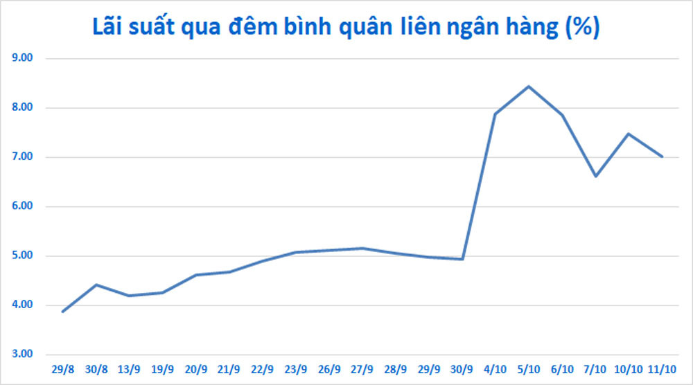 Lãi suất qua đêm giảm từ đỉnh 8,44%/năm ghi nhận hôm 5/10 xuống 6,61%/năm hôm 7/10, trước khi lên mức 7,02%/năm trong phiên 11/10.