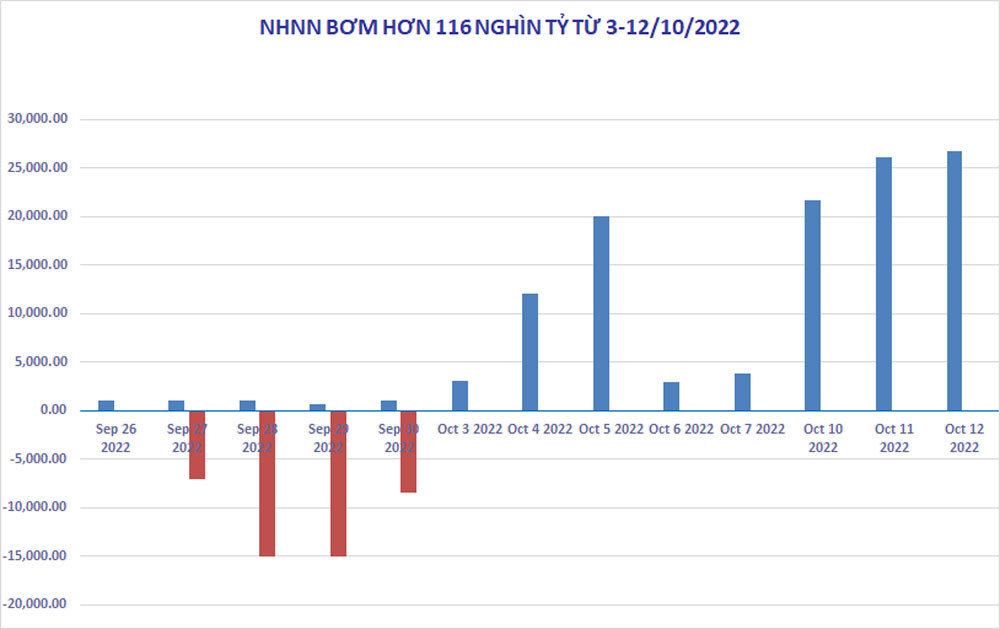 Riêng trong phiên giao dịch ngày 12/10, Ngân hàng Nhà nước đã bơm ròng gần 26.670 tỷ đồng qua hai kỳ hạn 28 ngày (gần 20.000 tỷ đồng) và kỳ hạn 14 ngày (6.666 tỷ đồng), với lãi suất đều là 5%/năm. Trong các phiên trước đó, mức bơm ròng cũng rất mạnh.