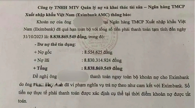 Gần đây, Công ty TNHH MTV Quản lý nợ và khai thác tài sản, Ngân hàng Xuất nhập khẩu Việt Nam (Eximbank AMC) đã có thông báo gửi ông P.H.A yêu cầu thanh toán gốc và lãi tạm tính đến ngày 31-10-2023 là hơn 8,8 tỉ đồng.