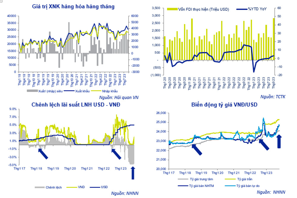 Cụ thể, theo báo cáo của Tổng cục Thống kê, trong 9 tháng đầu năm 2023, hoạt động xuất nhập khẩu hàng hóa thặng dư 21,6 tỷ USD; dịch vụ thâm hụt 6,7 tỷ USD; vốn FDI giải ngân 15,9 tỷ USD; lượng kiều hối 9-10 tỷ USD.