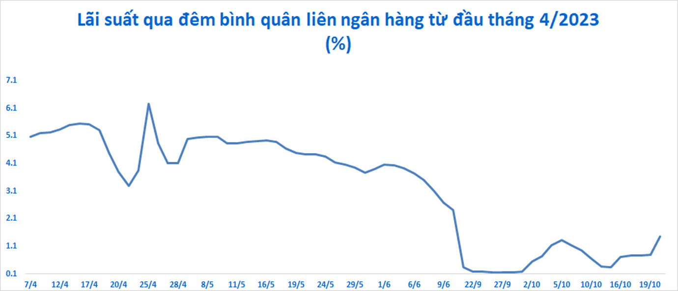 Mặc dù tỷ giá USD/VND trên hệ thống ngân hàng vẫn có xu hướng tăng nhưng áp lực lên đồng VND đã giảm bớt. Lãi suất trên thị trường liên ngân hàng đã tăng trở lại, từ vùng thấp kỷ lục 0,35%/năm hôm 13/10 lên mức 1,47%/năm trong phiên 20/10.