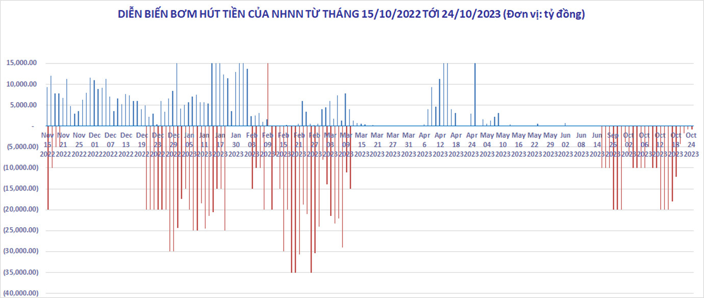 Tổng cộng kể từ ngày 21/9 cho tới 24/10, NHNN đã hút về hơn 263.000 tỷ đồng, trong khi đó có gần 30.000 tỷ đồng tín phiếu đáo hạn. Tổng lượng tiền hút ròng là 233.000 tỷ đồng.