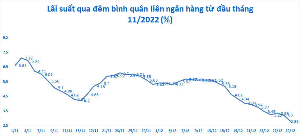 Lãi suất qua đêm trên thị trường liên ngân hàng trong tuần 26-29/12 giảm từ mức 3,49% hôm đầu tuần về 2,81% hôm cuối tuần (thấp hơn lãi suất qua đêm Mỹ, ở mức 4,33%/năm hôm 21/12), và thấp hơn mức 3,77%-4,34% trong tuần 19-23/12 và 4,62-5,62%/năm trong tuần 12-16/12. Lãi suất qua đêm ghi nhận cao nhất hôm 5/10 với 8,44%.