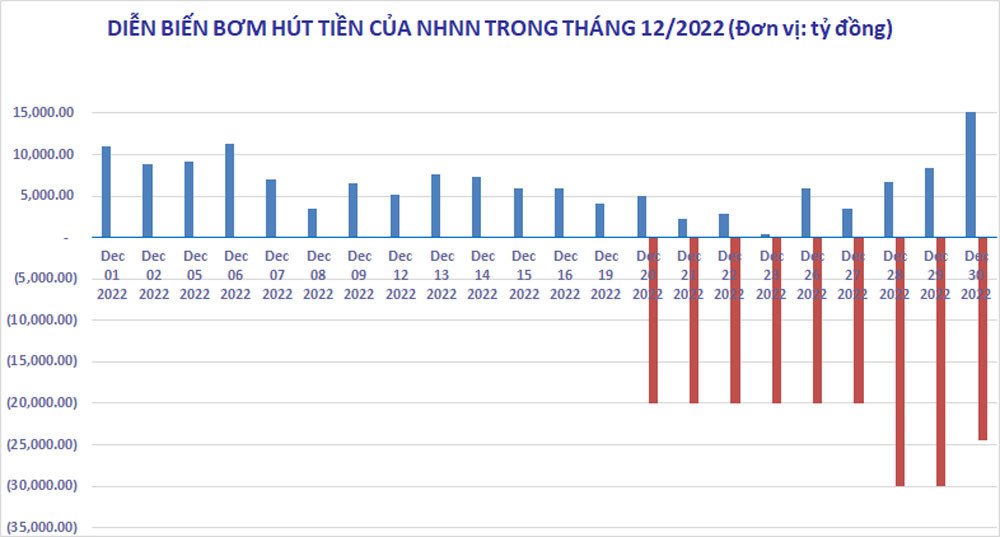 Ở chiều ngược lại, trong tuần 26-30/12, NHNN duy trì bơm tiền qua hợp đồng repo giấy tờ có giá kỳ hạn ngắn (7 ngày) nhưng với tổng giá trị thấp hơn chiều bơm tiền khá nhiều. Trong cả 5 phiên giao dịch, NHNN bơm ra thị trường tổng cộng gần 41.906 tỷ đồng.