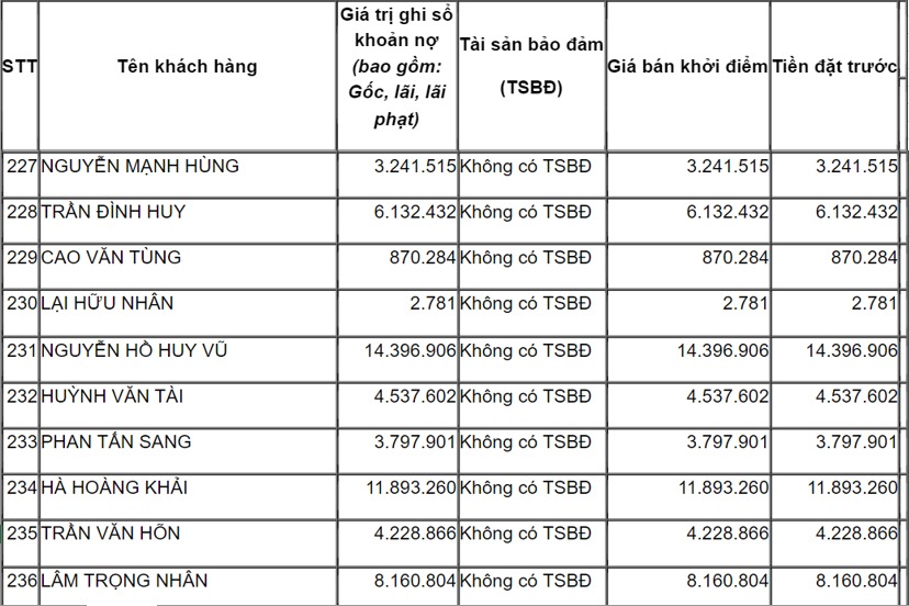 Theo Báo Thanh Niên thông tin, ngân hàng thông báo rao bán 498 khoản nợ với tổng giá trị là 9,64 tỷ đồng. Trong đó, khoản nợ có giá trị cao nhất là 188,4 triệu đồng và khoản nợ có giá trị thấp nhất là 2.781 đồng. Tất cả các khoản nợ này đều không có tài sản bảo đảm.