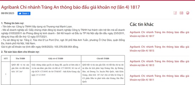 Agribank Chi nhánh Tràng An vừa thông báo bán đấu giá lần 4 khoản nợ là các lô đất thuộc dự án Khu du lịch Thiên Bảo Phú Quốc và Khu du lịch phức hợp Hoàng Hải (Phú Quốc). Theo thông báo, đây là tài sản đảm bảo cho các khoản vay của các doanh nghiệp liên quan đến Tân Hoàng Minh.