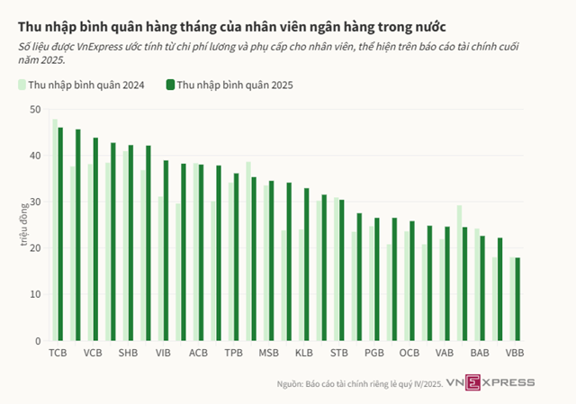 Do cách công bố thu nhập bình quân của các ngân hàng chưa thống nhất, VnExpress thực hiện ước tính bằng cách lấy tổng chi phí lương và phụ cấp chia cho số lượng nhân viên tại thời điểm cuối năm. Cách tính này có thể chưa phản ánh đầy đủ thu nhập của từng cá nhân, song phần nào cho thấy bức tranh đãi ngộ chung của ngành ngân hàng năm 2025.