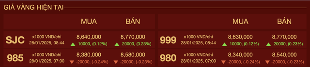 Sáng 28-1 (29 Tết), giá vàng miếng SJC được một số đơn vị kinh doanh ở TP HCM niêm yết mua vào ở mức 86,4 triệu đồng/lượng, bán ra ở 87,7 triệu đồng/lượng - duy trì mốc cao so với cuối ngày hôm qua.