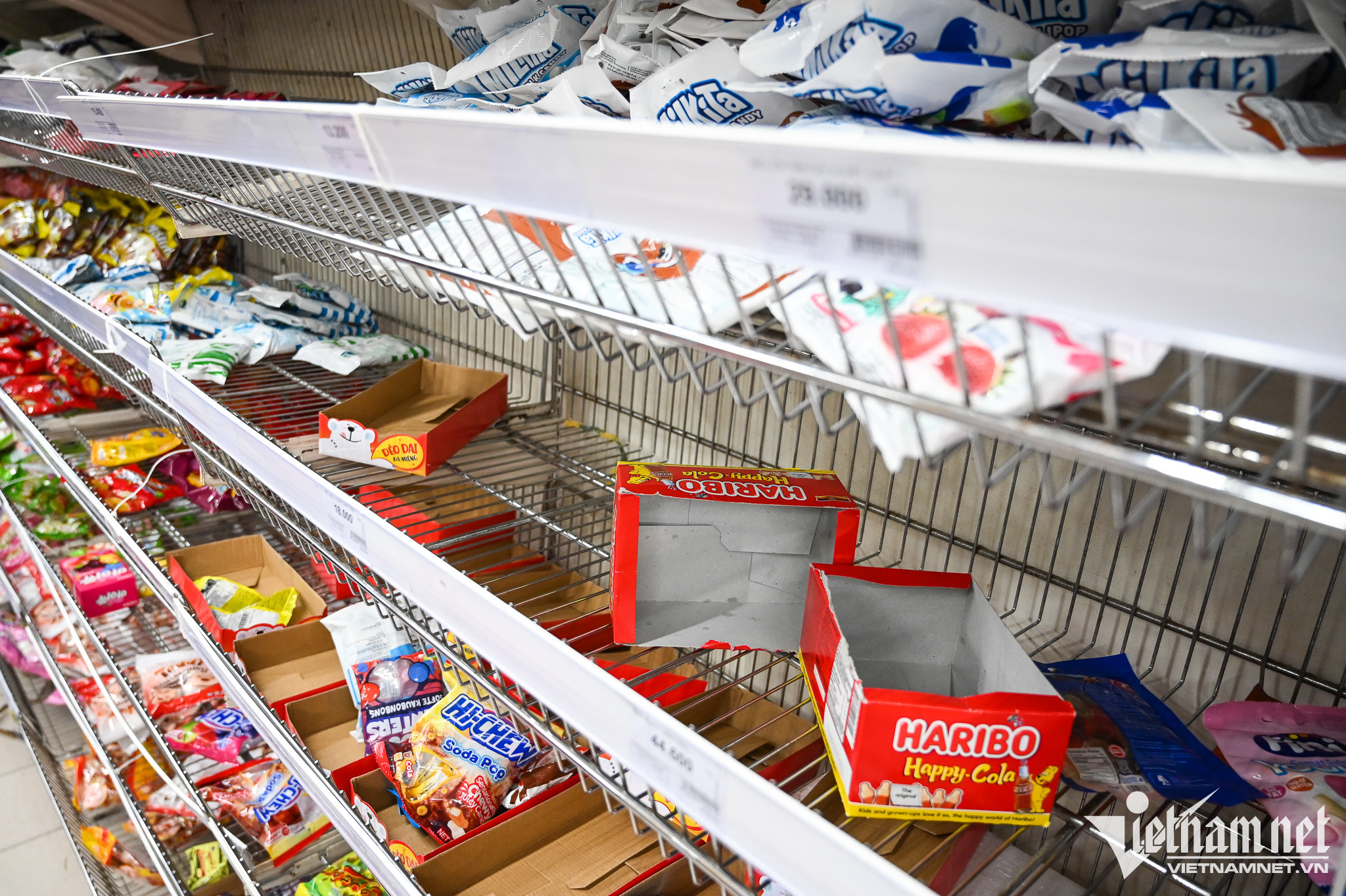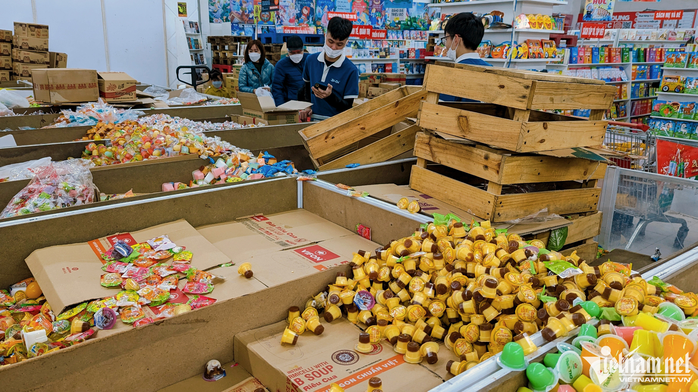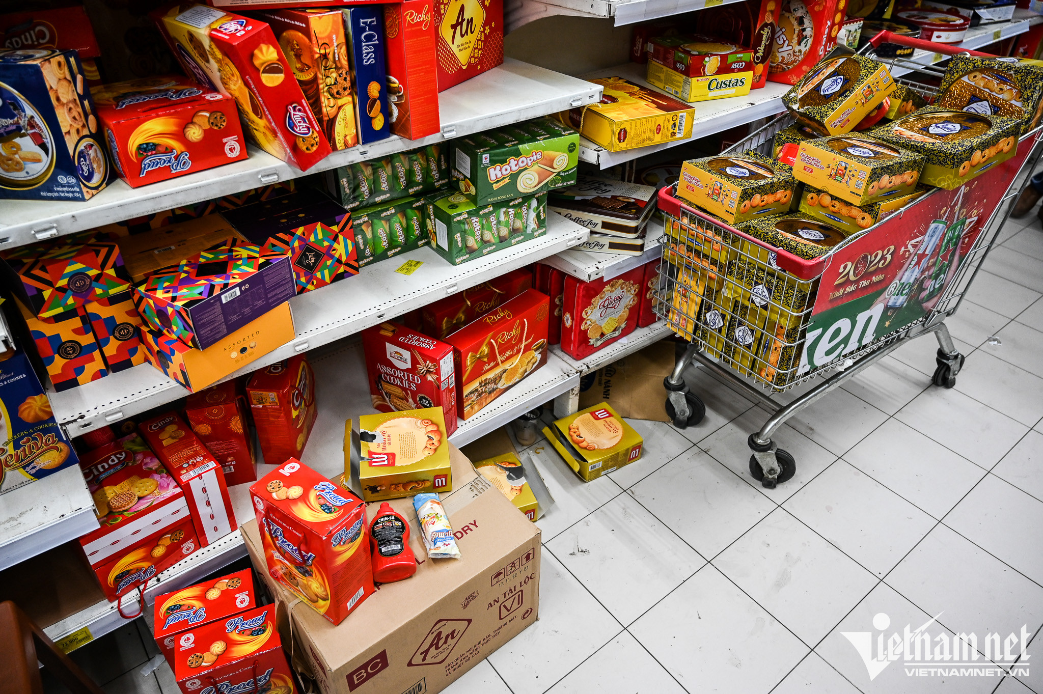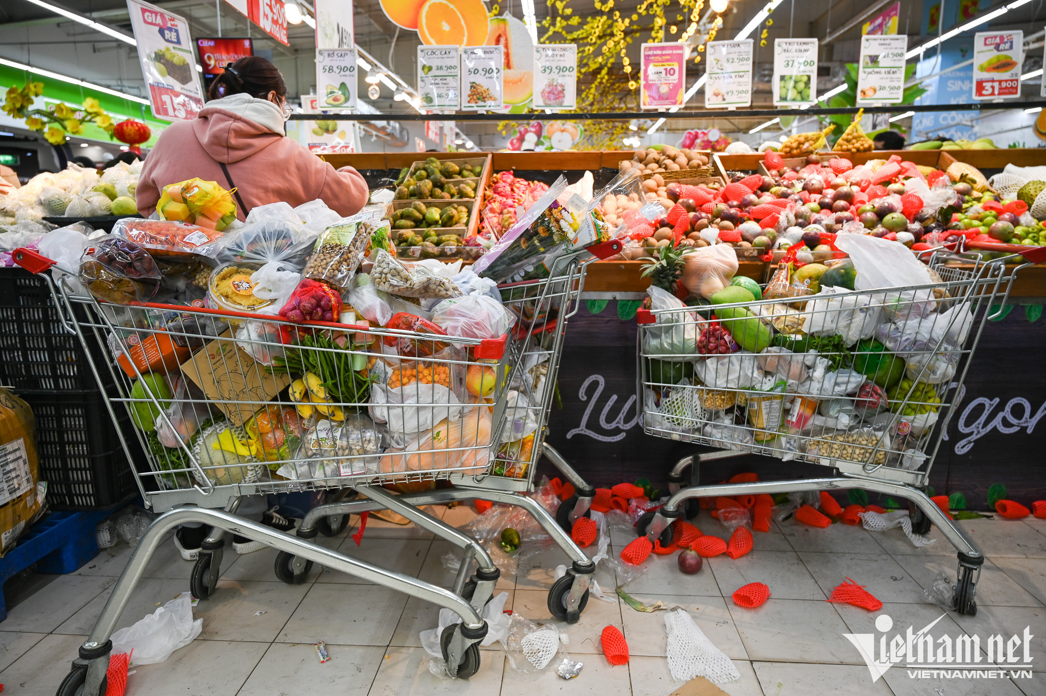 Trong buổi tối đầu tiên nghỉ lể (19/1), người dân đổ về các siêu thị ở Hà Nội mua sắm khiến nhiều mặt hàng thực phẩm, đồ khô trên kệ bị rỗng và đổ ngổn ngang, nhân viên không kịp bổ sung.