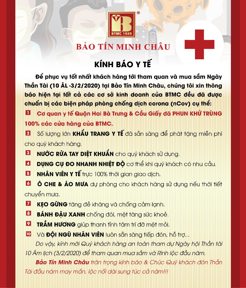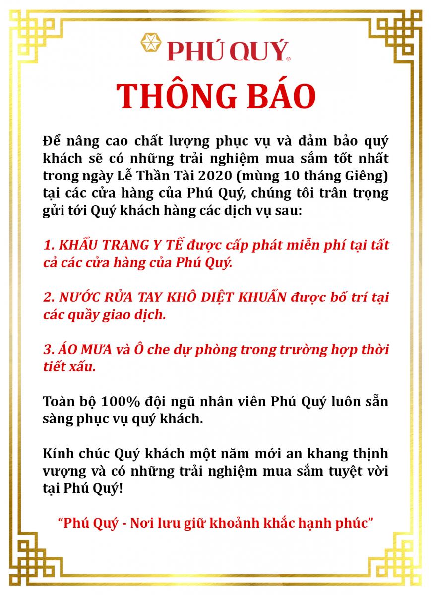 Cụ thể, tập đoàn Phú Quý phát thông báo, cho biết trong ngày Lễ Thần Tài 2020 (mùng 10 tháng Giêng) tại các cửa hàng của Phú Quý sẽ cung cấp các dịch vụ mới như: Phát khẩu trang y tế miễn phí, trang bị nước rửa tay khô diệt khuẩn thậm chí phát áo mưa và ô cho khách hàng trong trường hợp thời tiết xấu.