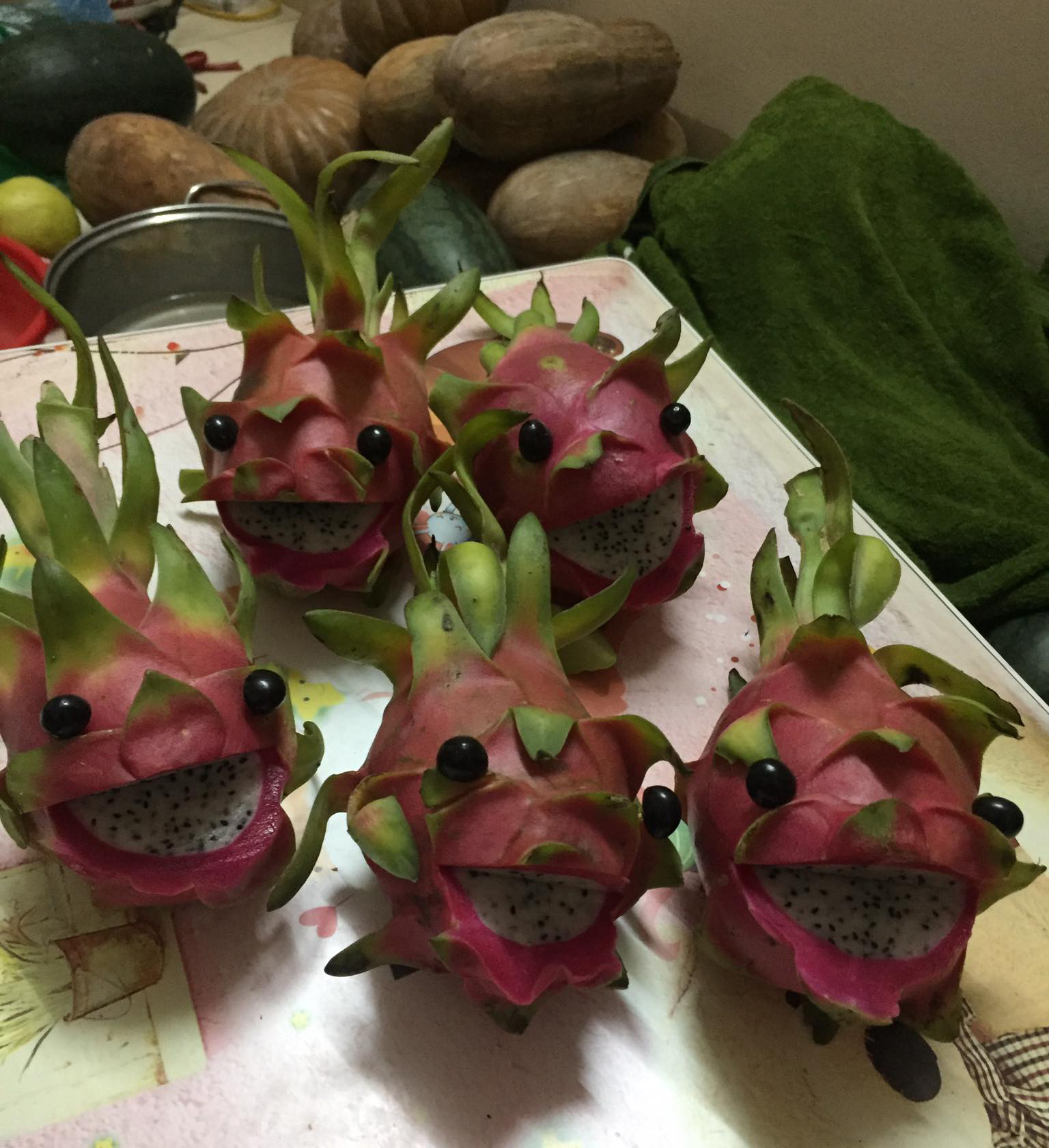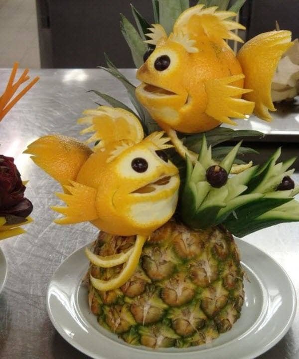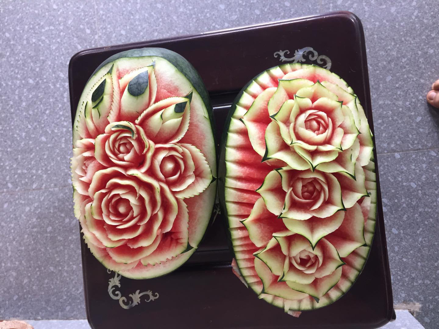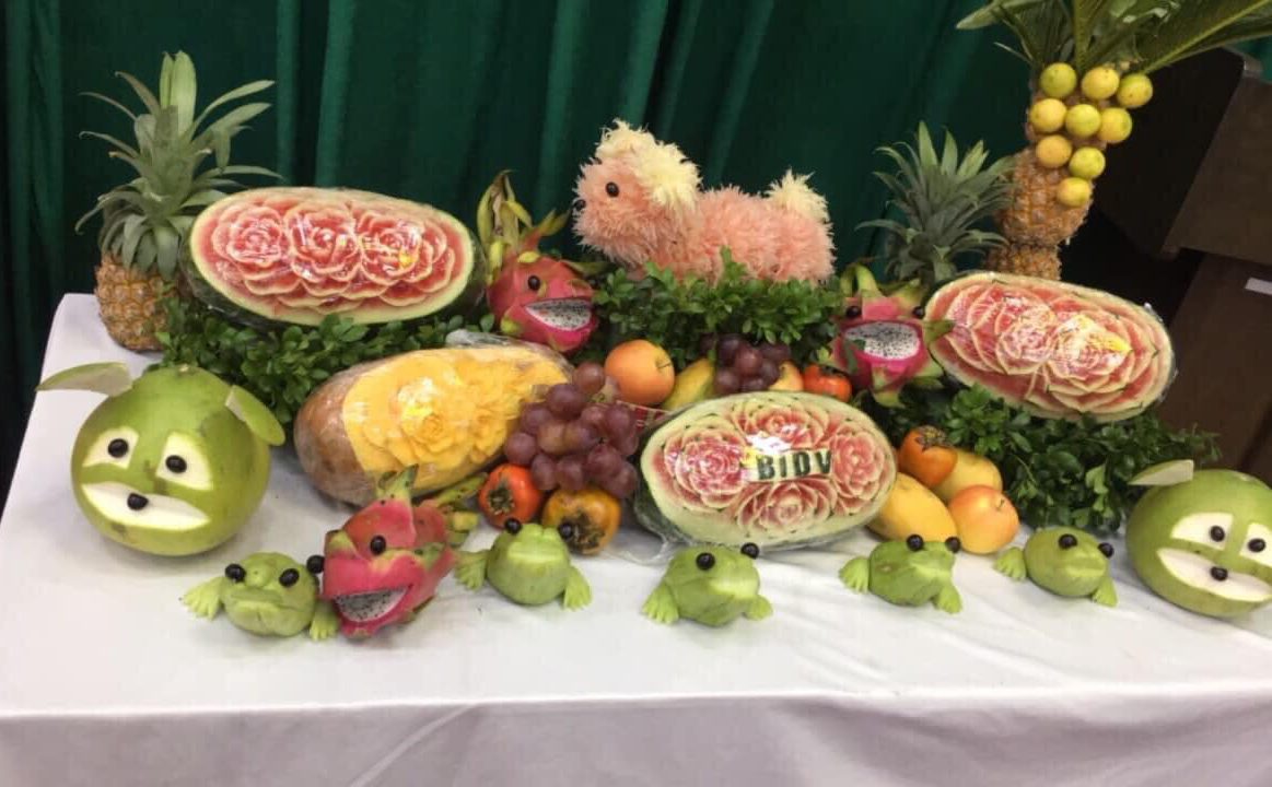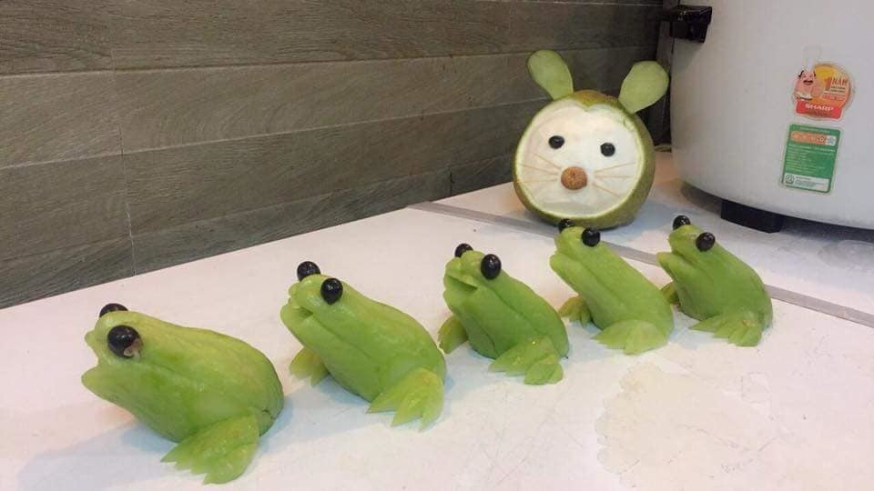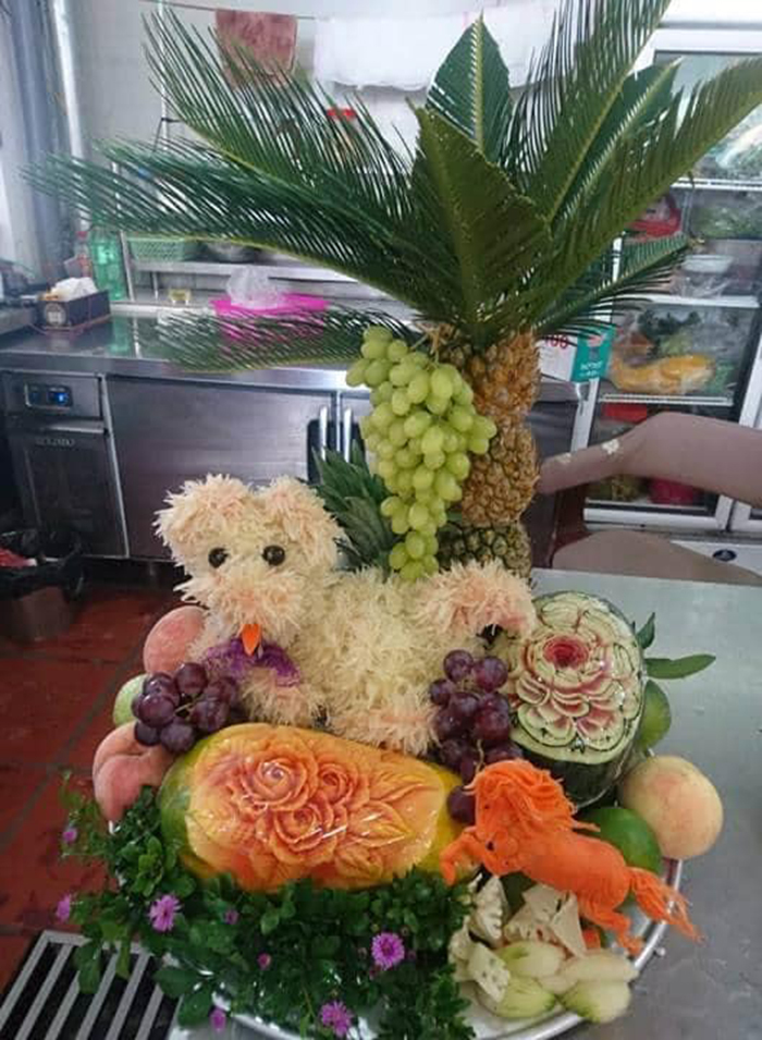 Cô giáo Ngọc cho hay, giá một chú chó con bằng bưởi từ 200.000-600.000 đồng. Một quả bưởi tỉa hoa 100.000-150.000 đồng tùy theo kích cỡ. Dưa hấu tỉa 150.000-250.000 đồng/quả. Bí ngô tỉa từ 300.000-400.000 đồng/quả. Những chú nhím bằng hành tây và gai bồ kết 30.000-50.000 đồng/con. Những chú ếch con tạo hình bằng quả su su 15.000-25.000 đồng/con. Những chú cá làm bằng thanh long 30.000-50.000 đồng/con,...