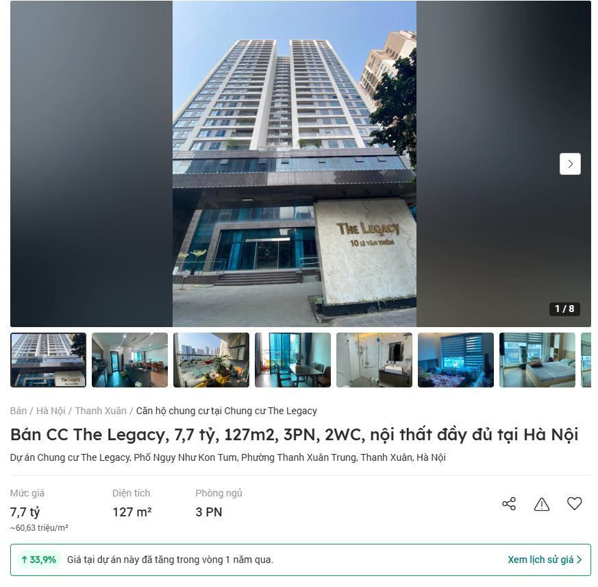 Vào năm 2020, chủ đầu tư chung cư The Legacy (phường Nhân Chính, quận Thanh Xuân) cũng chào bán căn hộ ở đây với mức giá dao động 32-36 triệu đồng/m2. Thời điểm đó, nhiều người đã đổ tiền ra mua do được quảng cáo là căn hộ thuộc phân khúc hạng sang cùng nhiều dịch vụ "5 sao" như bể bơi, bãi đỗ xe thông minh, sân vui chơi... Tuy nhiên, đến khi dự án hoàn thành, cư dân đến ở thì thấy không như lời quảng cáo. Mặc dù thế, giá căn hộ tại dự án này vẫn tăng gần gấp đôi sau gần 4 năm, hiện đang được rao bán với mức giá 60-65 triệu đồng/m2.