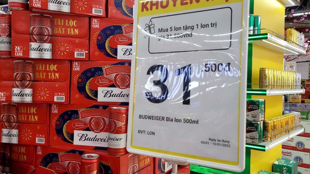 Khảo sát bia Tết ở các cửa hàng tạp hóa, siêu thị thấy thị trường năm nay khá trầm lắng. Ở siêu thị, biển hiệu giảm giá bia Tết nhiều hơn như mua 5 lon tặng 1 lon, một thùng tặng 5 lon… hoặc giảm giá từ 5-10% nhưng cũng khó thu hút khách hàng.