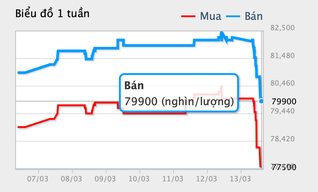 Lúc 15 giờ, Công ty SJC niêm yết giá vàng miếng SJC mua vào 78 triệu đồng/lượng, bán ra 80,5 triệu đồng/lượng, giảm tới 2 triệu đồng mỗi lượng so với cuối ngày hôm qua. Biên độ chênh lệch giá mua – bán vàng được đẩy lên tới 2,5 triệu đồng/lượng.