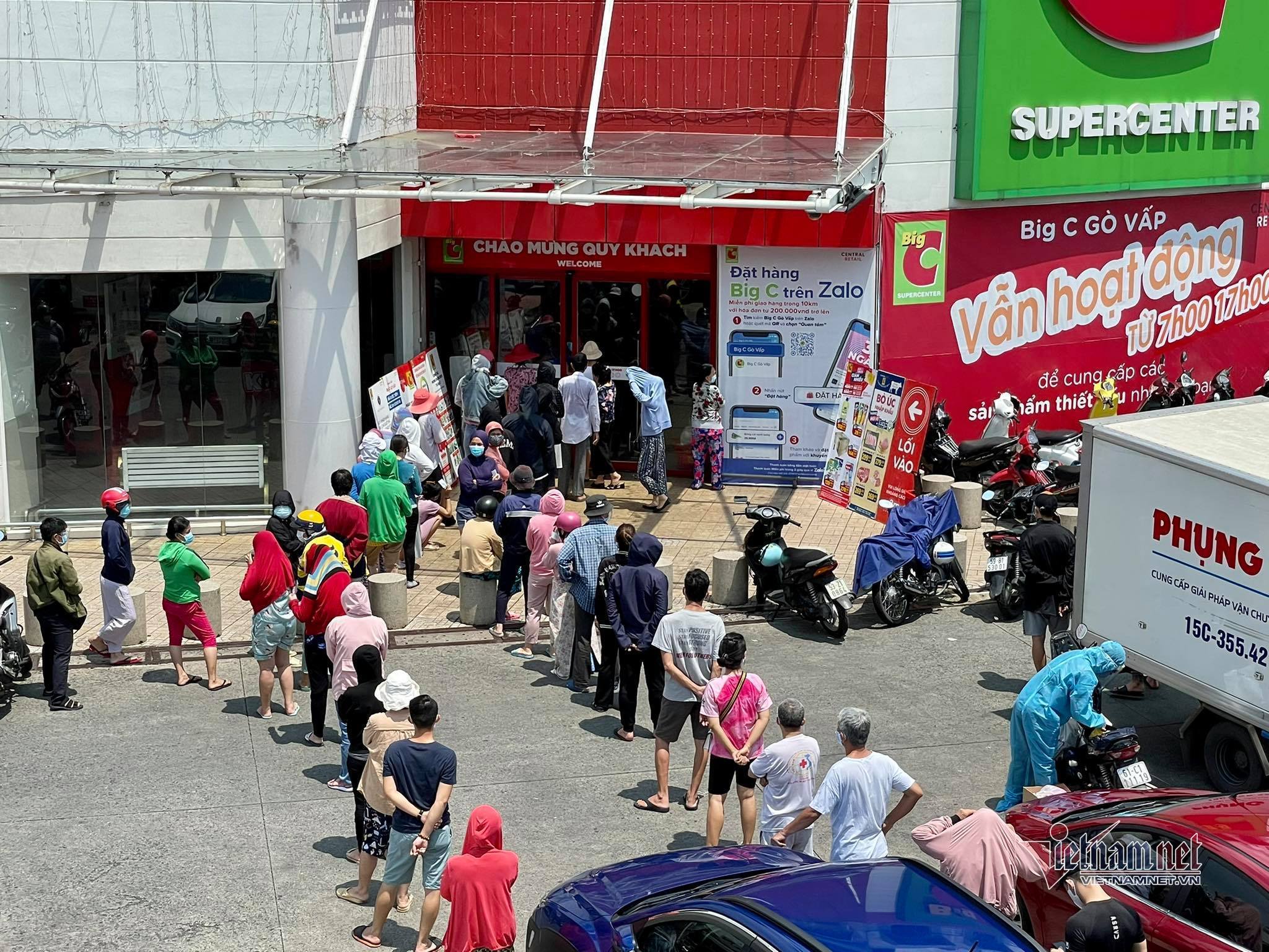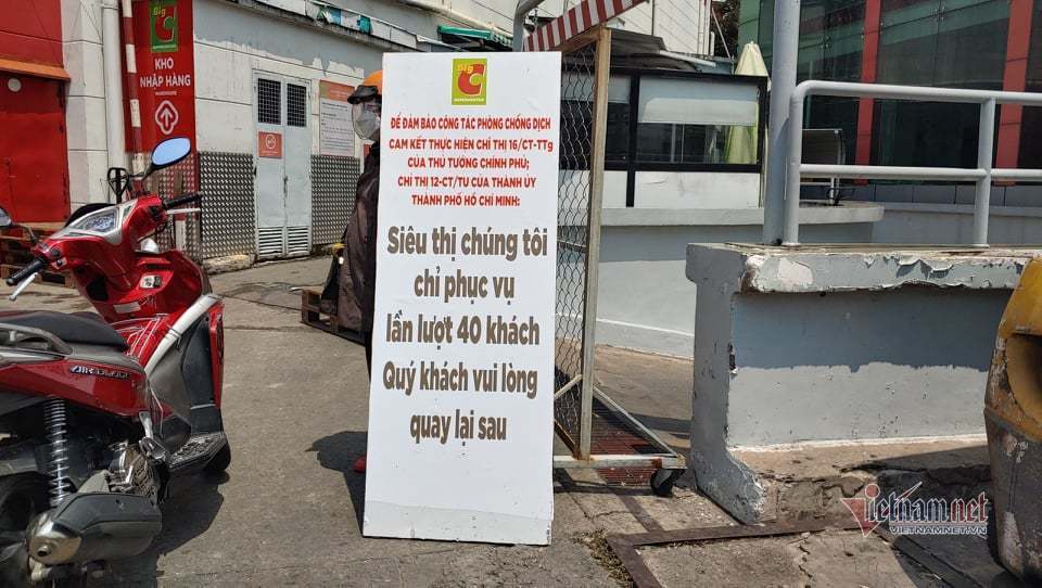 Tại siêu thị, người dân tiến hành khai báo y tế rồi mới được vào bên trong. Bên trong siêu thị không quá đông đúc đảm bảo giãn cách. Nhân viên siêu thị bên ngoài thông báo cho những ngoài cổng, đầu giờ chiều quay lại khi lượng người xếp hàng chờ mua thực phẩm còn dài.