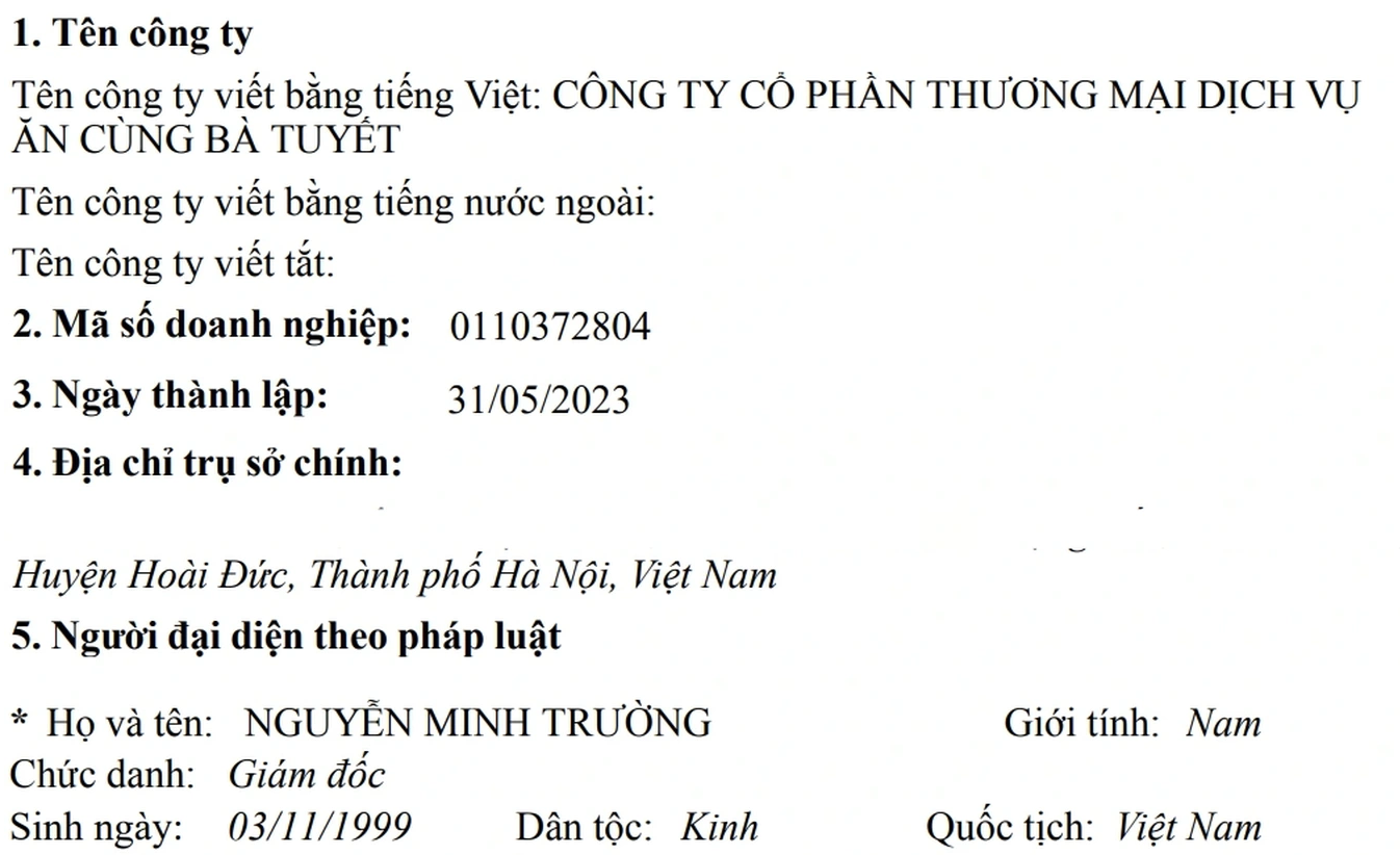 Theo Cổng thông tin quốc gia về đăng ký doanh nghiệp, Công ty CP Thương mại Dịch vụ Ăn Cùng Bà Tuyết được thành lập vào ngày 31/5/2023. Doanh nghiệp này có ngành nghề kinh doanh chính là Bán buôn thực phẩm, địa chỉ trụ sở chính của công ty tại xã Khánh An, huyện Hoài Đức, Hà Nội. Người đại diện theo pháp luật là Nguyễn Minh Trường, chính là con trai bà Tuyết.