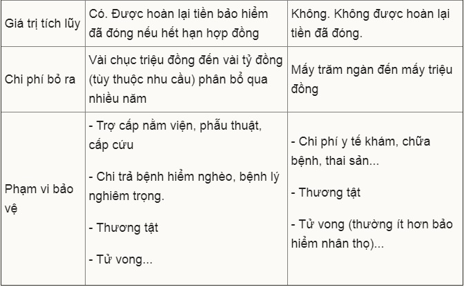 Dưới đây là so sánh sơ bộ bảo hiểm nhân thọ và bảo hiểm chi phí y tế (một trong những loại bảo hiểm phi nhân thọ phổ biến nhất).