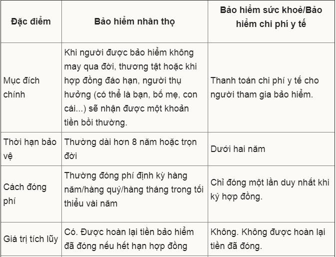 Điểm khác biệt lớn nhất giữa bảo hiểm nhân thọ với bảo hiểm sức khỏe (bảo hiểm phi nhân thọ) là bảo hiểm nhân thọ có giá trị tích lũy. Tham gia bảo hiểm nhân thọ là kế hoạch tài chính dài hơi, giúp đảm bảo tài chính cho bạn và người thân khi người được bảo hiểm (thường là trụ cột hoặc lao động chính trong nhà) có biến cố lớn như tử vong hay thương tật xảy ra. Khi tham gia bảo hiểm nhân thọ càng sớm thì phí bảo hiểm phải đóng sẽ càng thấp hơn. Tuy nhiên, gói bảo hiểm nhân thọ phù hợp với những người có kế hoạch tài chính rõ ràng và khả năng đóng phí bảo hiểm trong nhiều năm.