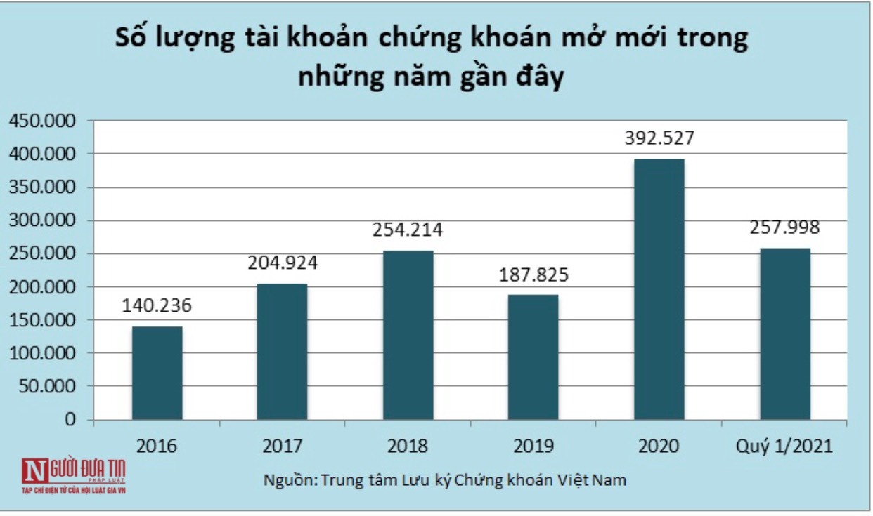 Tuy nhiên, anh Tiến chỉ là một trong hàng trăm nghìn nhà đầu tư cá nhân mới gia nhập thị trường chứng khoán trong quý I/2021. Theo thống kê từ Trung tâm Lưu ký Chứng khoán (VSD), trong 3 tháng đầu năm thị trường ghi nhận có 257.998 tài khoản chứng khoán mở mới, bằng 65% số lượng tài khoản mới trong cả năm 2020.