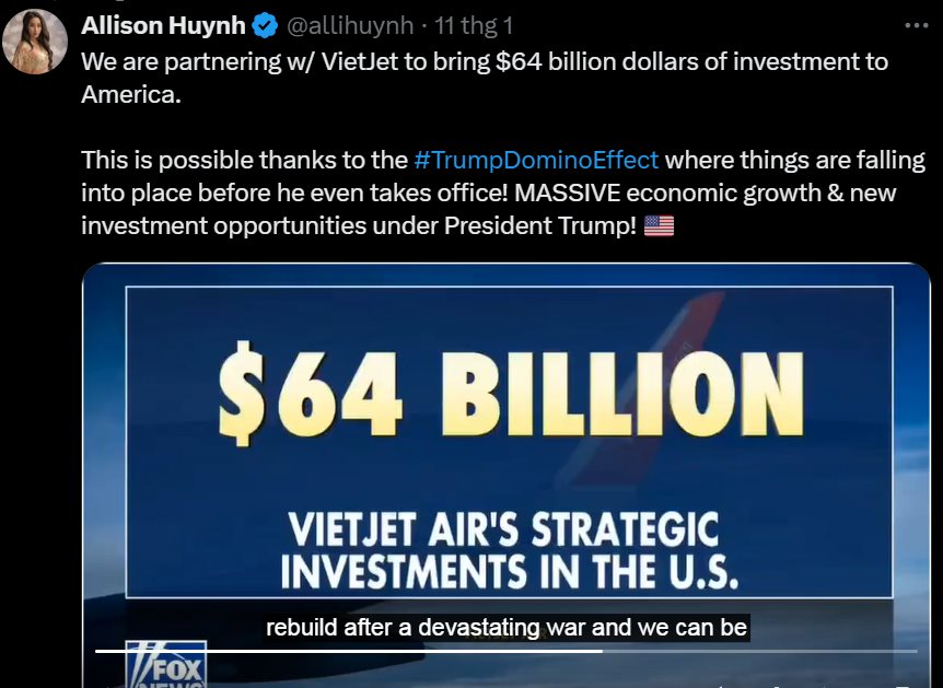 Theo chia sẻ trên X, bà cho biết Alo Ventures - công ty do bà sáng lập đang hợp tác với Vietjet để mang lại khoản đầu tư trị giá 64 tỷ USD vào Mỹ.