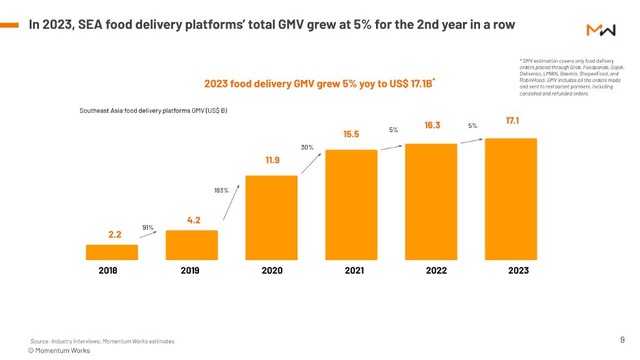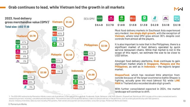 Chịu áp lực liên tiếp trong việc phải đạt được lợi nhuận bền vững, hầu hết các công ty tiếp tục hạn chế trợ cấp cho các đơn hàng và áp dụng các chiến lược khác biệt để cạnh tranh. Tính đến cuối năm 2023, Grab chiếm 55% GMV (Gross Merchandise Value - Tổng giá trị giao dịch) giao đồ ăn trong khu vực, tiếp theo là Foodpanda với 15,8% và Gojek với 10,5%.