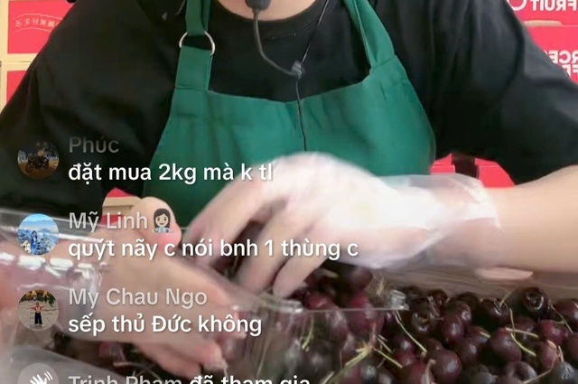 Chiều 14-2, tài khoản TikTok có tên T.V có hơn 310.000 lượt theo dõi, livestream tại cửa hàng sỉ trái cây có địa chỉ trên đường Thạch Lam (quận Tân Phú). Hơn 900 người đang xem trực tiếp. Người bán đã giới thiệu cherry Chile với giá 350.000 đồng/thùng 2,5 kg (loại to) và có rất nhiều khách hỏi mua.