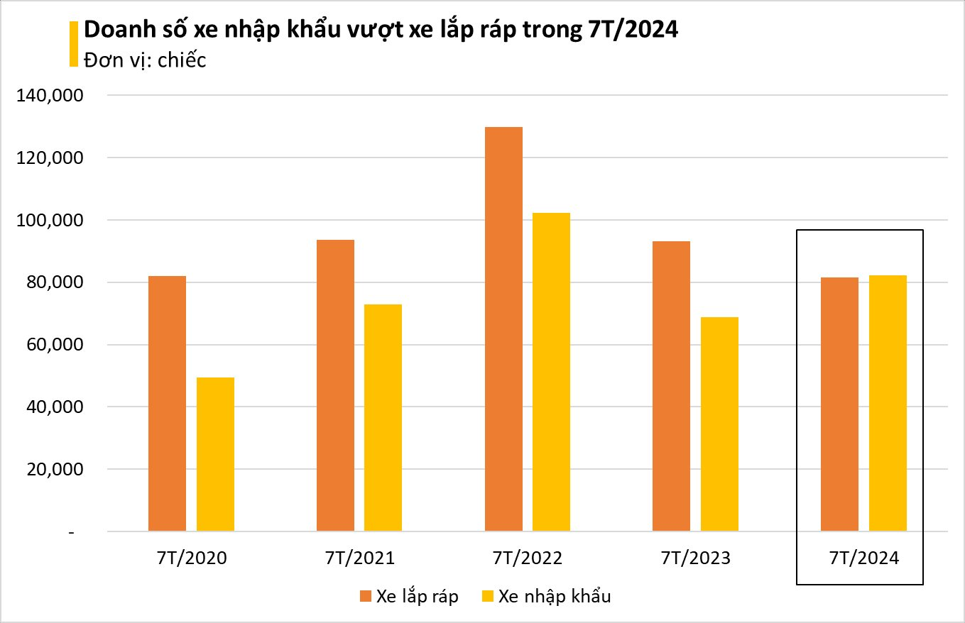 Tính chung 7 tháng đầu năm, doanh số xe lắp ráp đạt 81.637 chiếc, giảm 12% so với cùng kỳ. Còn nhóm ô tô nhập khẩu đã bàn giao 82.167 xe cho khách hàng trong nước, tăng tới 19%. Có thể thấy, xe nhập khẩu chính thức vượt mặt xe sản xuất, lắp ráp trong nước về doanh số thay vì kém khoảng cách lớn như các năm trước.