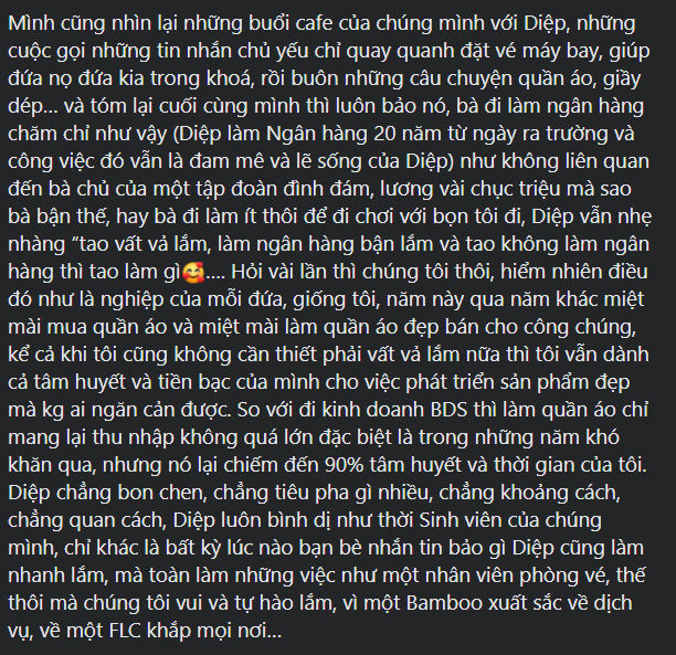 Bà Nga cũng kể rằng bà luôn hỏi người bạn thân của mình "lương vài chục triệu mà sao bà bận thế, hay bà đi làm ít thôi để đi chơi với bọn tôi đi nhưng bà Diệp vẫn nhẹ nhàng “tao vất vả lắm, làm ngân hàng bận lắm và tao không làm ngân hàng thì tao làm gì?".