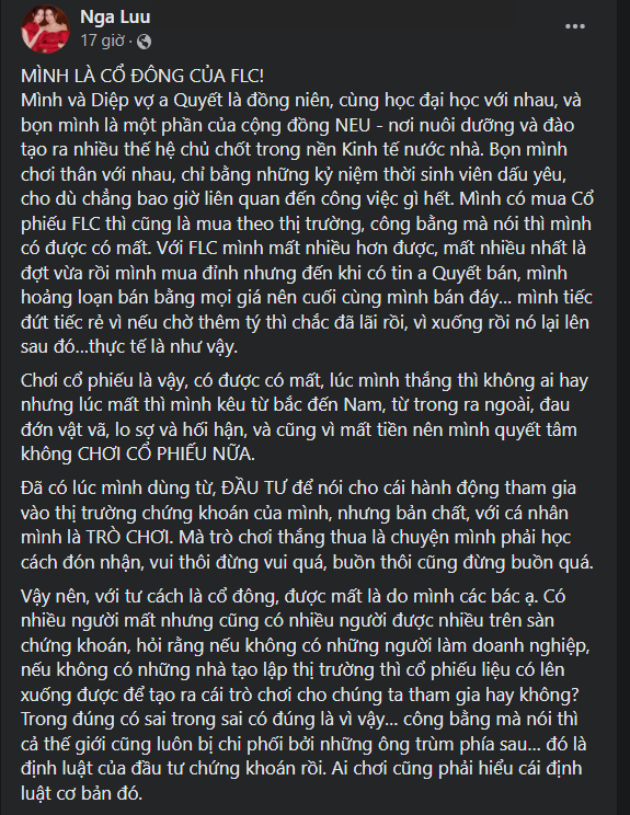 Bà Lưu Nga cũng chia sẻ rằng phu nhân của ông Trịnh Văn Quyết đã làm ngân hàng 20 năm từ ngày ra trường và công việc đó vẫn là đam mê, lẽ sống của bà Diệp và dường như bà không liên quan đến hình ảnh bà chủ của một tập đoàn đình đám.