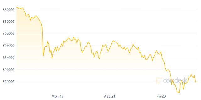 Đợt tăng giá bắt đầu hụt hơi vào cuối tuần trước, khi Bitcoin đột ngột giảm 17% xuống còn 52.149 USD, khi một nửa mức giảm diễn ra chỉ trong khoảng 20 phút. Dù đã hồi phục phần nào, nhưng diễn biến tiêu cực vẫn ổn định, kết thúc phiên thứ Sáu ở mức 50.620 USD.