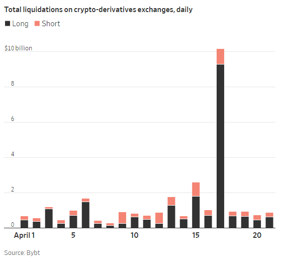 Theo nhà cung cấp dữ liệu Bybt, tổng cộng, nhà đầu tư đã bán tháo 10,1 tỷ USD giá trị tiền số trên các sàn giao dịch. Hơn 90% số vị thế bị bán tháo ngày hôm đó đến từ khoản đặt cược tăng giá vào Bitcoin hoặc các đồng tiền số khác. Thậm chí, gần 5 tỷ USD vị thế bị thanh lý đã diễn ra chỉ trên một sàn là Binance.