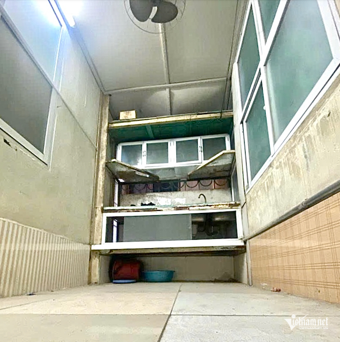 Tầng 2 của căn nhà chỉ có duy nhất một bàn bếp và tủ đựng bát đơn giản; không gian sinh hoạt chật chội, chỉ khoảng 3 bước chân là hết nhà.