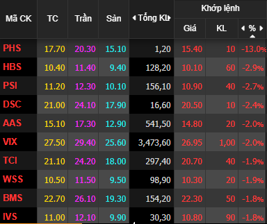 Có đến 24 mã cổ phiếu chứng khoán sáng nay chìm trong sắc đỏ. Cá biệt có cổ phiếu PHS của chứng khoán Phú Hưng đứng đầu đà giảm với mức -13%. Tiếp đến là HAC của Chứng khoán Hải Phòng, TCI của Chứng khoán Thành Công...đều giảm giá khá sâu.