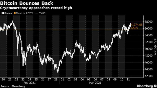 Theo hãng tin Bloomberg, trưa nay (12/3) theo giờ Việt Nam, giá Bitcoin có lúc đạt 57.679 USD, cách không xa mức kỷ lục mọi thời đại 58.350 USD thiết lập vào hôm 21/2.