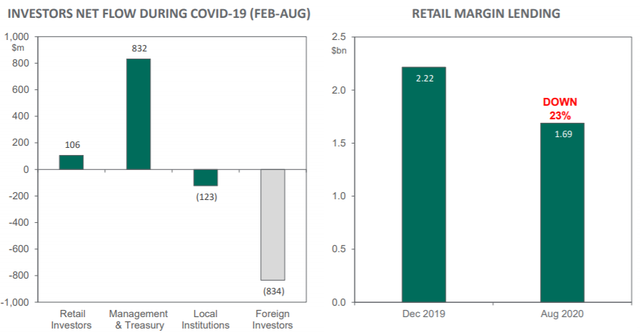 Thống kê của Dragon Capital cho thấy lực đỡ thị trường trong giai đoạn từ tháng 2 tới tháng 8 (giai đoạn dịch Covid-19 bùng phát) chủ yếu đến từ nhóm các doanh nghiệp và ban lãnh đạo khi họ đã mua ròng 832 triệu USD, bên cạnh đó là các nhà đầu tư cá nhân khi mua vào 106 triệu USD.