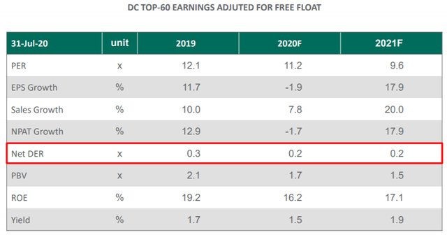 Tăng trưởng EPS của top 60 doanh nghiệp năm nay dự báo âm 1,9%, trong khi năm trước tăng trưởng 11,7%. Dragon Capital đánh giá tăng trưởng EPS năm 2021 sẽ tăng trưởng 17,9%. Tỷ lệ nợ trên vốn cổ phần (Net DER) các doanh nghiệp hiện ở mức 0,2 lần, giảm so với mức 0,3 lần của năm 2019.