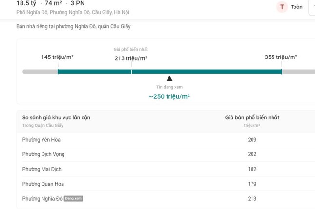 Cuối năm ngoái, chị Kim Oanh (Hoàng Mai, Hà Nội) hỏi mua một căn nhà riêng 4 tầng diện tích 74m2 trong ngõ ở phố Nghĩa Đô (Cầu Giấy), khi ấy chủ nhà báo giá 16,5 tỷ đồng, nhưng chị Oanh không mua vì ngõ nhỏ, nhà cũ mà giá thì trên trời. Cách đây vài ngày, chị tá hỏa khi thấy chủ nhà rao bán căn nhà trên các trang mạng xã hội và sàn môi giới bất động sản với giá 18,5 tỷ đồng, tương đương 250 triệu đồng/m2.