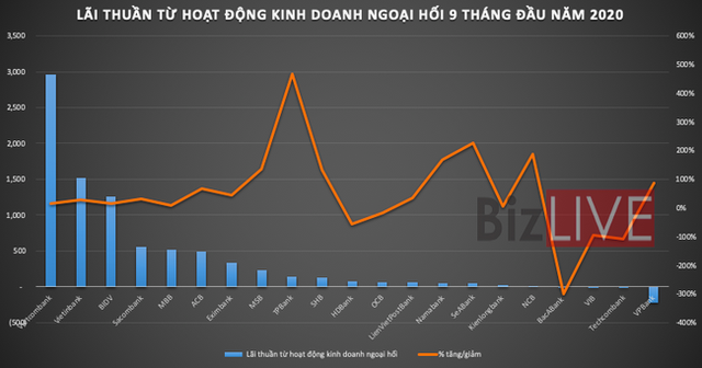 Trong đó, TPBank là một trong những ngân hàng ghi nhận lợi nhuận từ hoạt động kinh doanh ngoại hối tăng mạnh nhất trong kỳ qua với mức tăng tới 468%, từ 25 tỷ đồng trong 9 tháng đầu năm 2019 lên 142 tỷ đồng 9 tháng đầu năm nay. Dù so với tổng thu nhập hoạt động trong kỳ, thu nhập lãi thuần từ kinh doanh ngoại hối vẫn chiếm tỷ trọng khá khiêm tốn (2%), nhưng sự tăng trưởng đột biến về lợi nhuận trên vẫn cho thấy một tín hiệu khả quan.