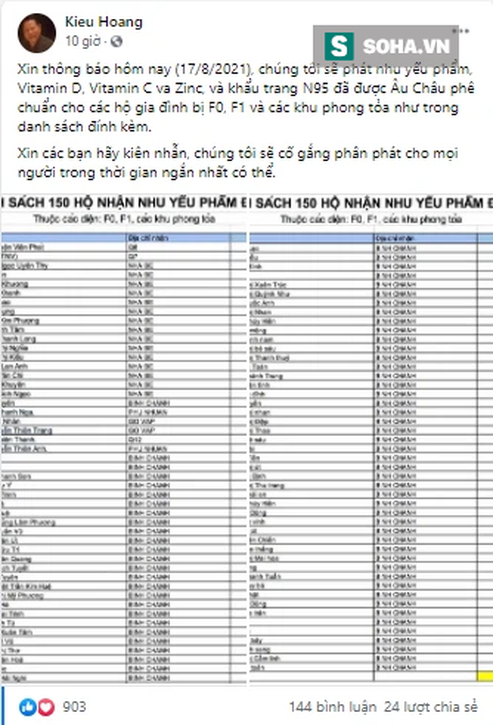 Sáng hôm nay, tỷ phú gốc Việt này đăng tải một thông báo khẩn kèm danh sách 100 hộ gia đình có F0, F1 được đoàn từ thiện của ông phát nhu yếu phẩm ngày hôm nay:
