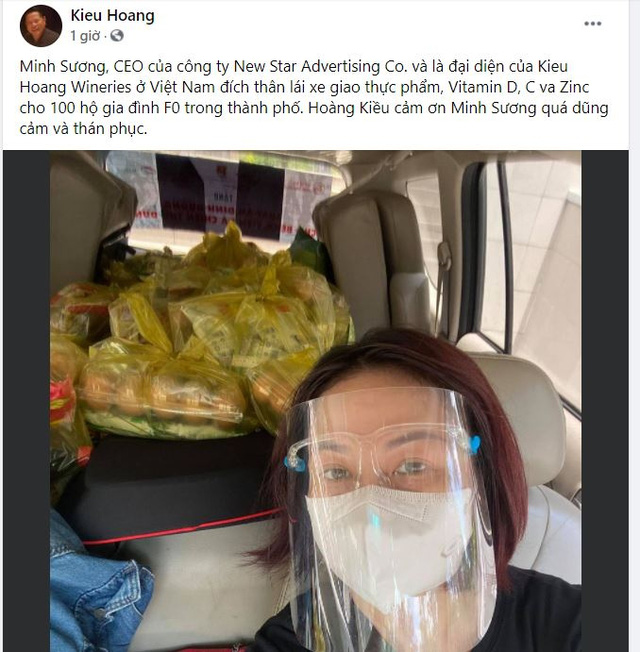 Trên trang cá nhân, một loạt hoạt động từ thiện tại Việt Nam được doanh nhân Hoàng Kiều liên tục cập nhật. Cụ thể, khi nhận tin nhắn cầu cứu khẩn cấp, dù đang ở Mỹ, ông Hoàng Kiều lập tức gửi nhu yếu phẩm, thuốc bổ, thực phẩm cho hàng loạt F0, F1 khó khăn ở TP.HCM.