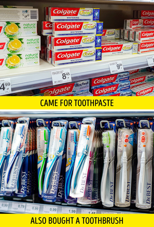 Chiêu xếp sản phẩm theo cặp được các siêu thị ưa dùng. Ví dụ, trà và cà phê thường đặt cạnh nhau, xúc xích thì thường xếp ngay quầy bán tương ớt, kem đánh răng đặt cạnh bàn chải đánh răng,.